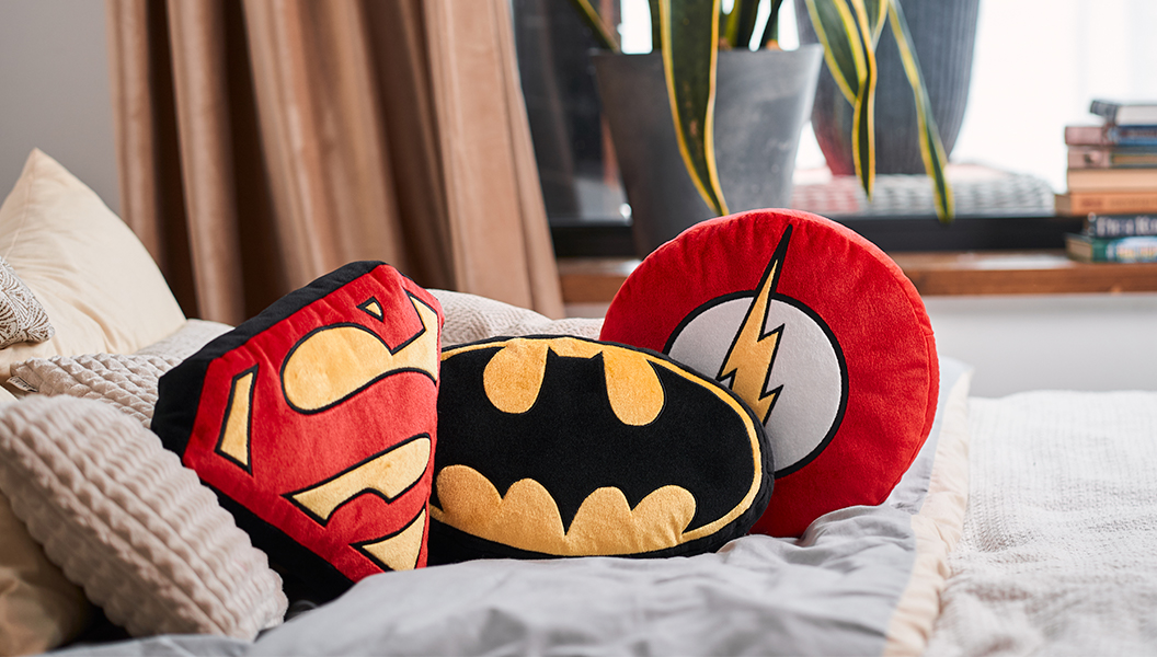 Но лучше обычной подушки могут быть только декоративные подушки с символикой легендарных героев Лиги Справедливости, таких как: Batman, Superman Flash из DC Comics.