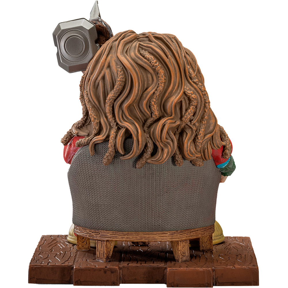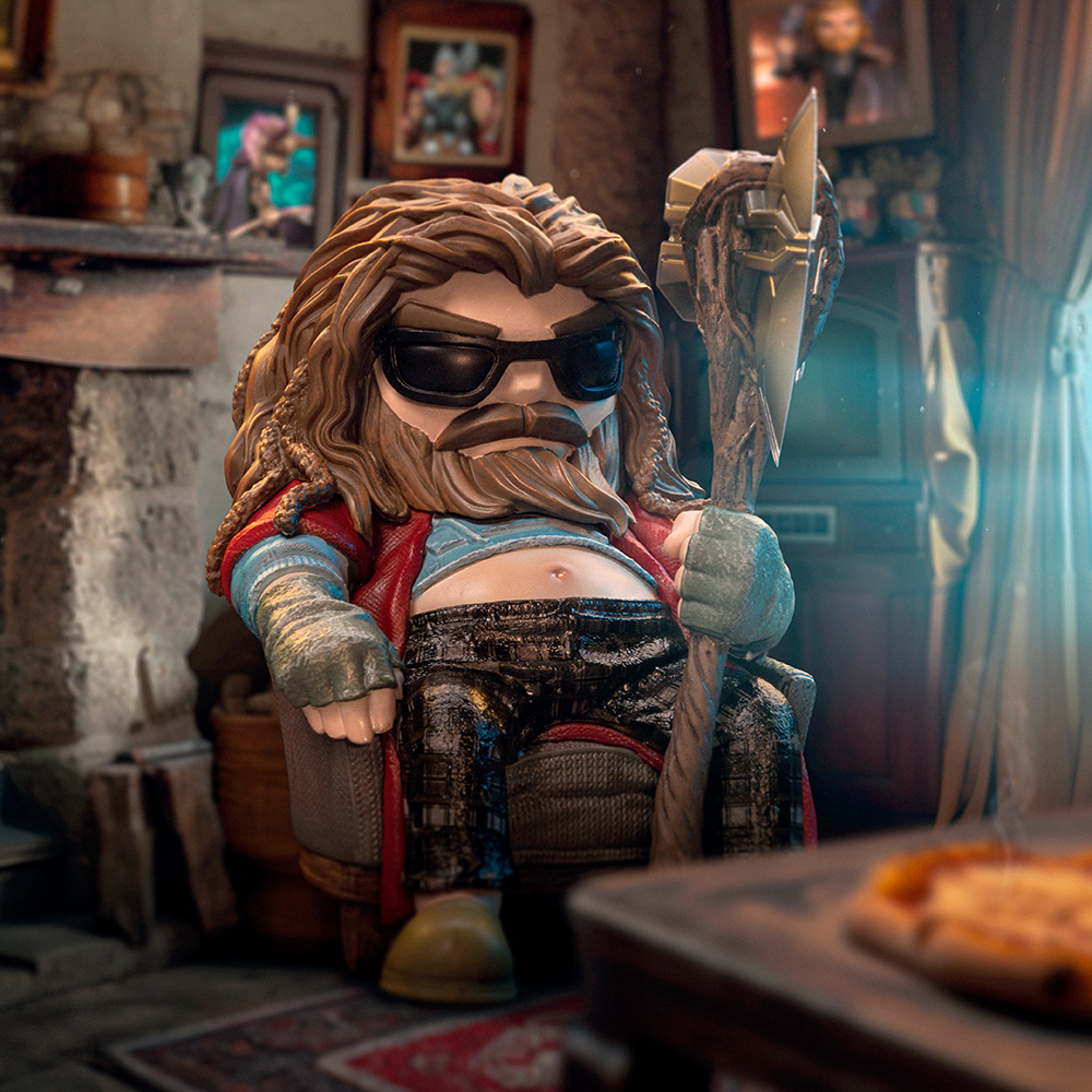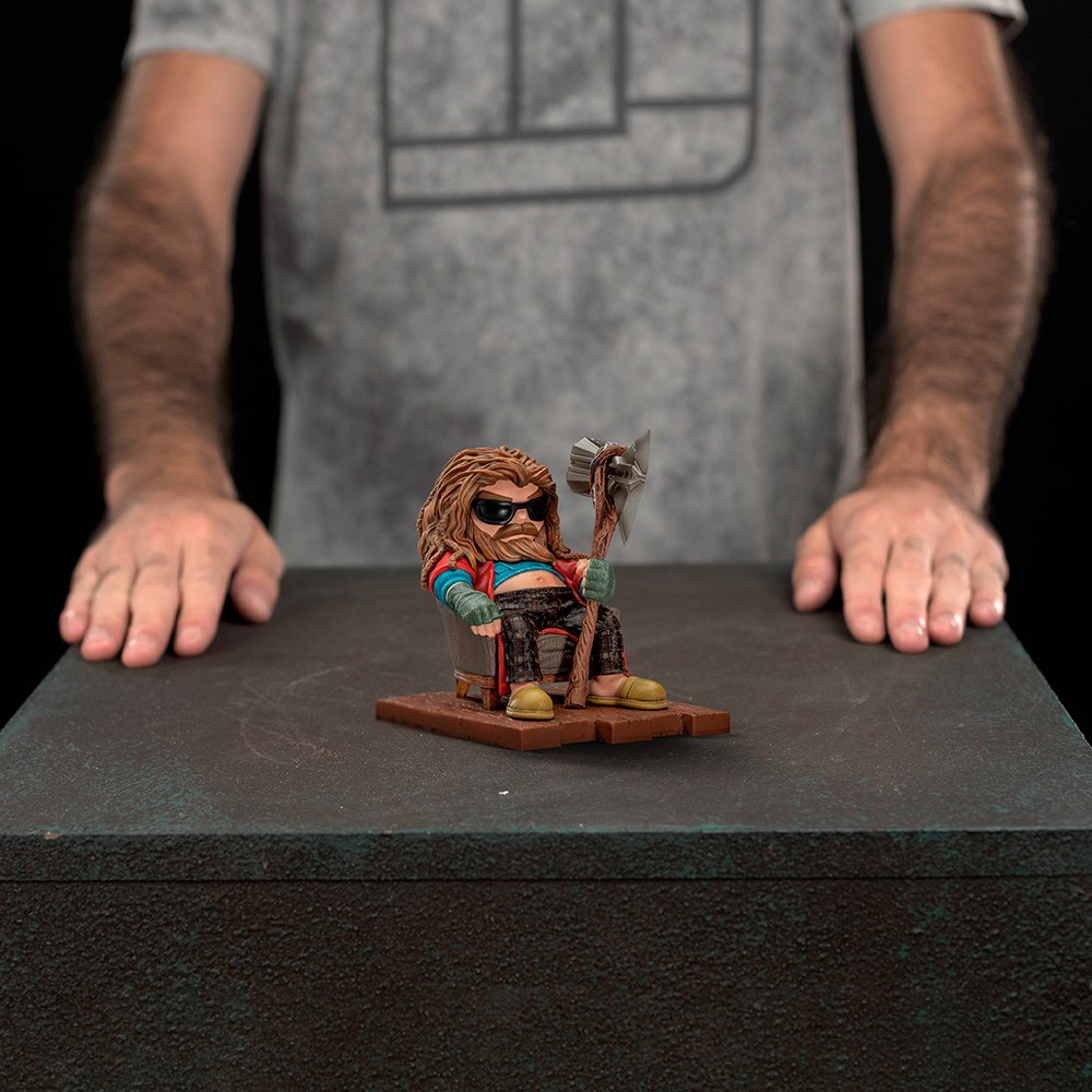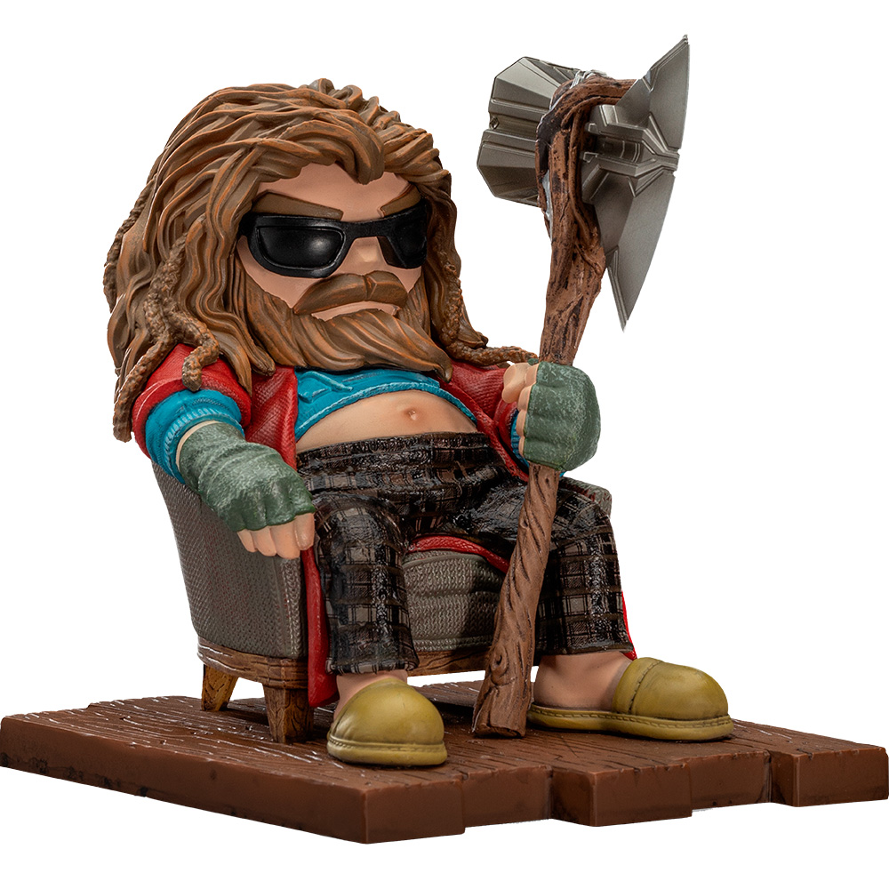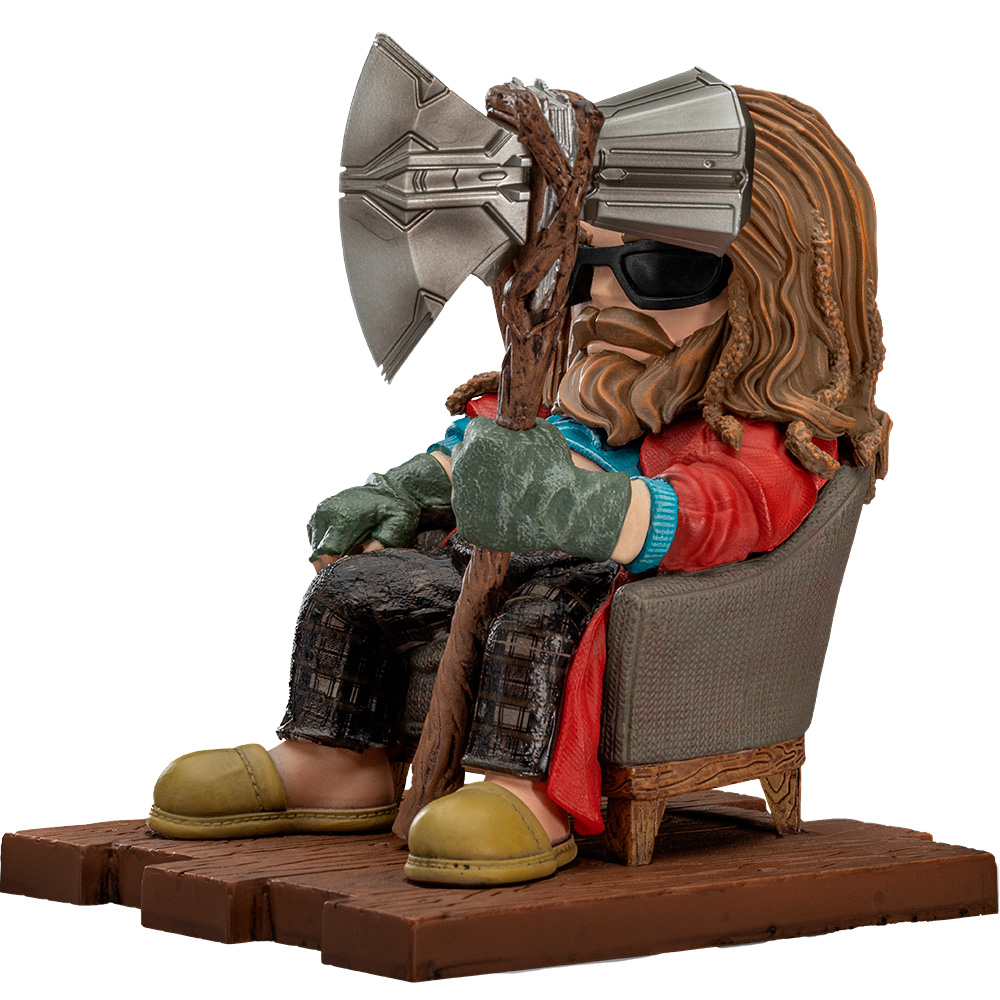 Слегка располневший и опечаленный тем, что не смог помешать злодею Таносу использовать Перчатку Бесконечности для уничтожения половины населения Вселенной, расслабленный асгардский бог грома удобно расположился в глубоком кресле в своем доме в Тенсберге, Норвегия. После того, как он в течение 5 лет сидел дома, много пил и ел каждый день, а также играл в видеоигры, чтобы убежать от реальности, он превратился в домоседа, толстого и неуклюжего парня, который едва ли напоминает могучего Тора. В толстовках, клетчатых пижамных штанах и красном халате, с солнцезащитными очками на лице и тапочками на ногах, опирающийся на свой топор Разрушителя бурь, Iron Studios представляет статуэтку “Брат Тор - Infinity Saga - MiniCo”, забавную и стереотипную версию Бога грома после образ жизни, состоящий из пиццы, сэндвичей, пива и тому подобного.