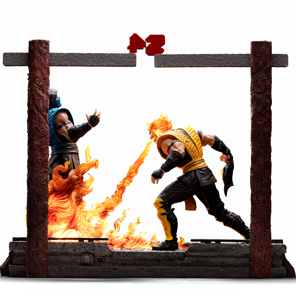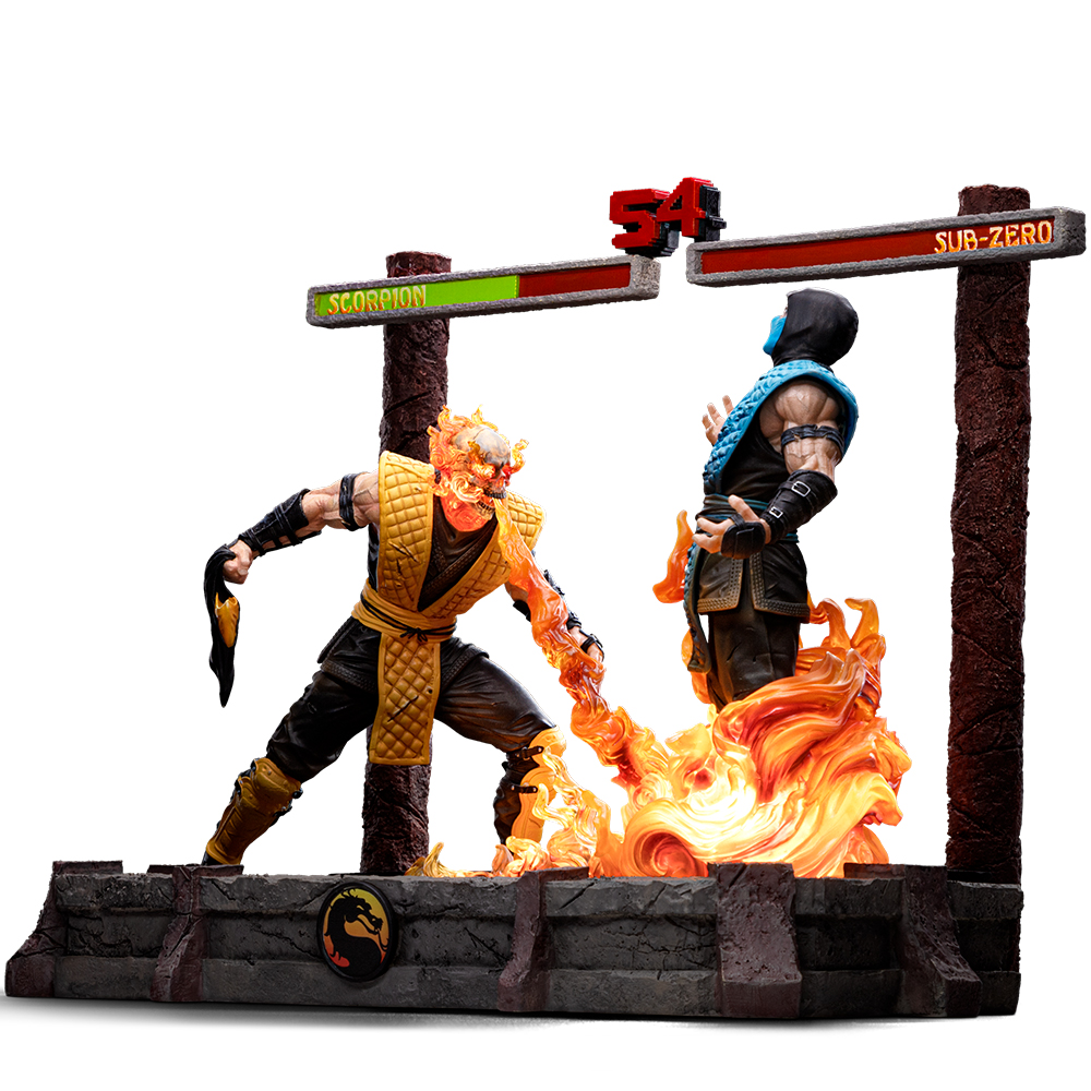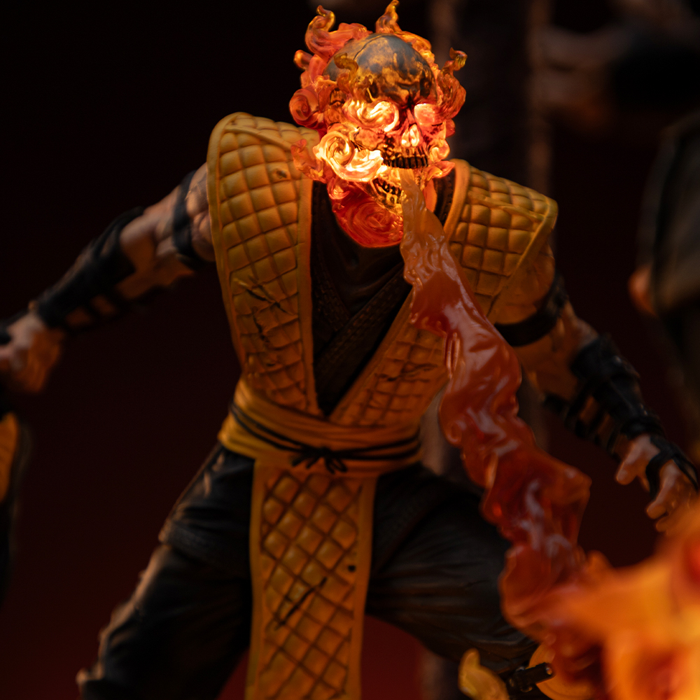 В глубинах Преисподней, адского подземного мира Mortal Kombat, два легендарных воина-ниндзя сразятся в своей последней битве. Движимый жаждой мести, призрачный дух японского клана ниндзя Ширай Рю раскрывает свой истинный облик, обнажая огненное лицо скелета, и совершает свой роковой ход — выпускает адское дыхание на своего замороженного противника, который мучительно страдает, когда сгорает заживо после битвы со своим самым старым заклятым врагом. Iron Studios представляет статуэтку "Scorpion Fatality - Mortal Kombat - Делюкс в художественном масштабе 1/10", изображающую двух самых знаковых персонажей легендарного файтинга в диораме, где все языки пламени — от головы Скорпиона до ног Саб-Зиро — подсвечиваются светодиодными эффектами, запечатлевающими поединок, который заканчивается в смертельный исход для одного из противников.