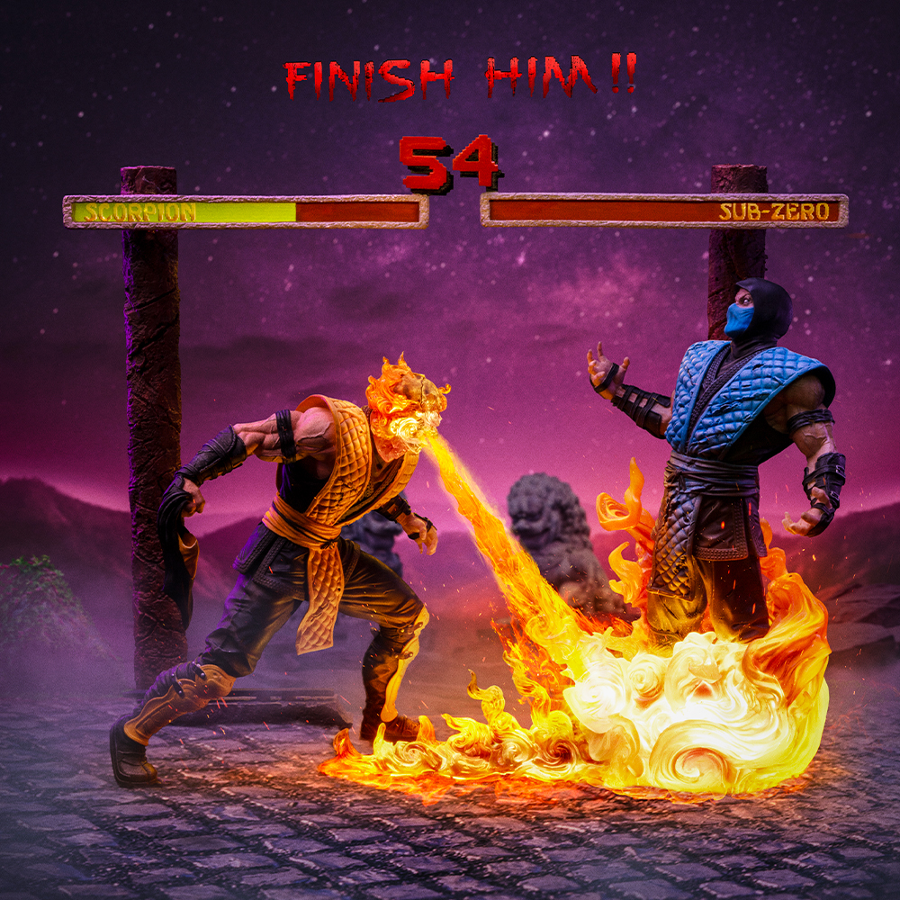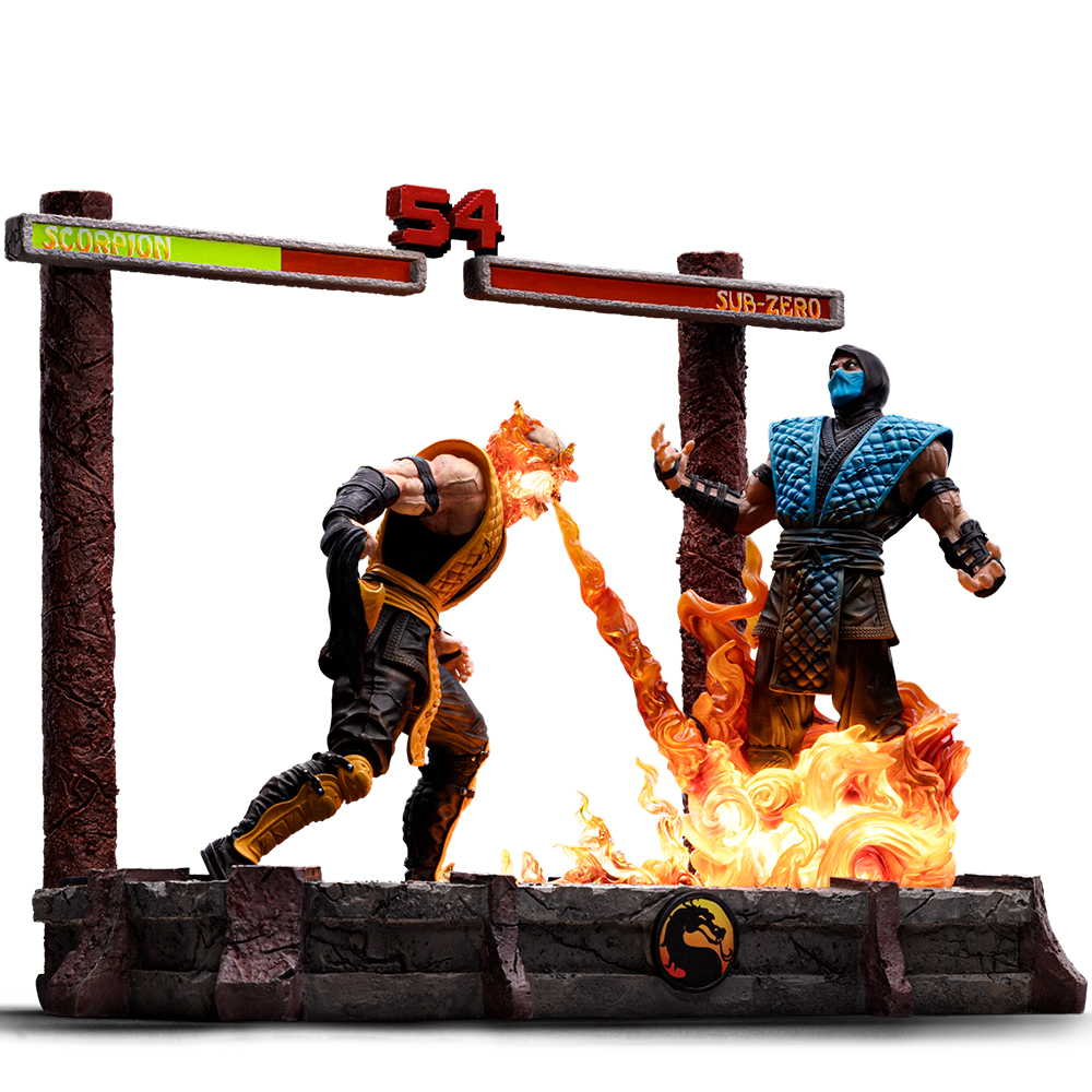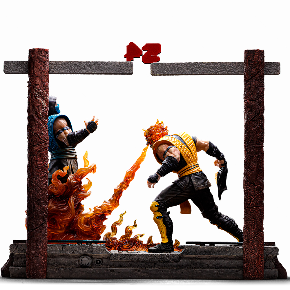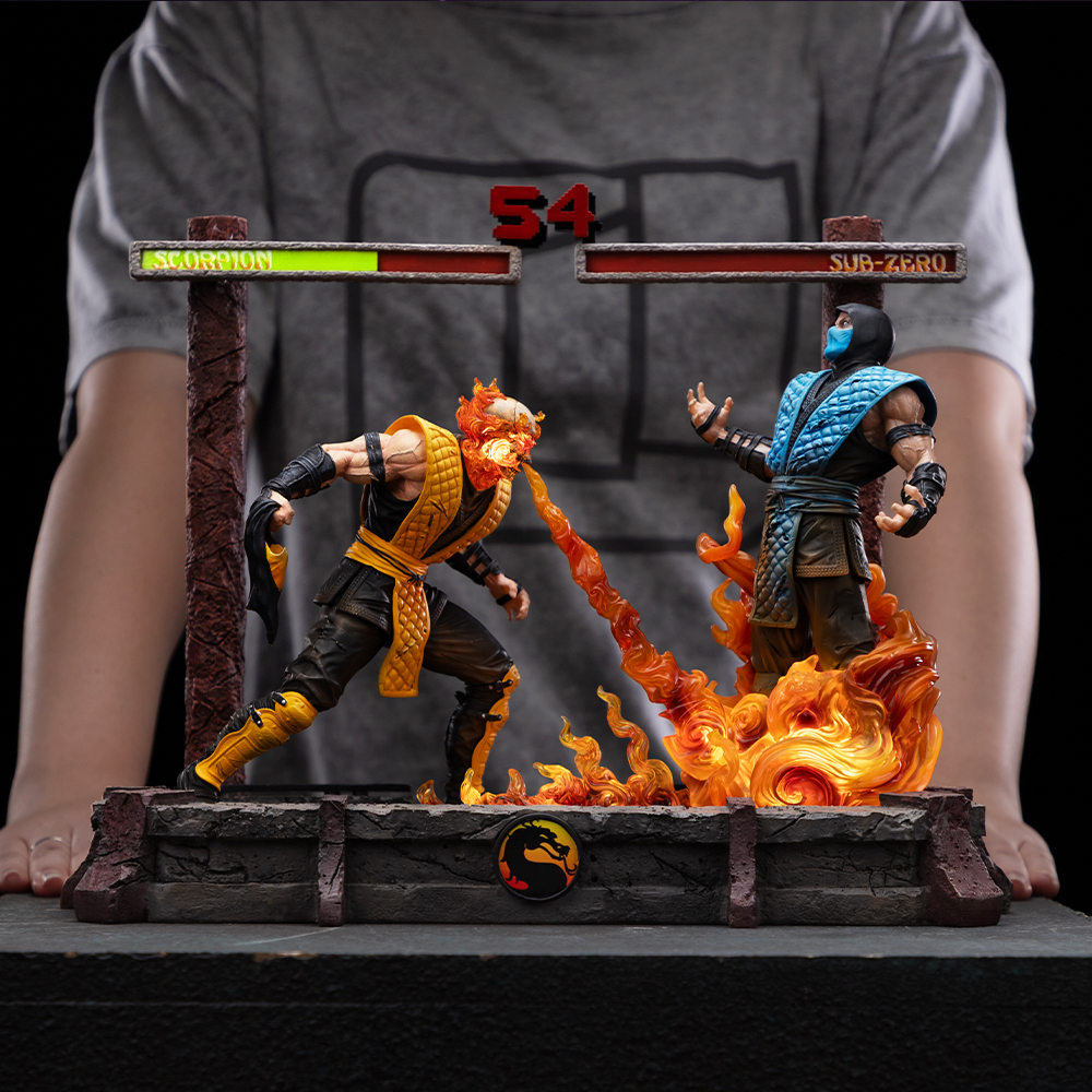 В глубинах Преисподней, адского подземного мира Mortal Kombat, два легендарных воина-ниндзя сразятся в своей последней битве. Движимый жаждой мести, призрачный дух японского клана ниндзя Ширай Рю раскрывает свой истинный облик, обнажая огненное лицо скелета, и совершает свой роковой ход — выпускает адское дыхание на своего замороженного противника, который мучительно страдает, когда сгорает заживо после битвы со своим самым старым заклятым врагом. Iron Studios представляет статуэтку "Scorpion Fatality - Mortal Kombat - Делюкс в художественном масштабе 1/10", изображающую двух самых знаковых персонажей легендарного файтинга в диораме, где все языки пламени — от головы Скорпиона до ног Саб-Зиро — подсвечиваются светодиодными эффектами, запечатлевающими поединок, который заканчивается в смертельный исход для одного из противников.