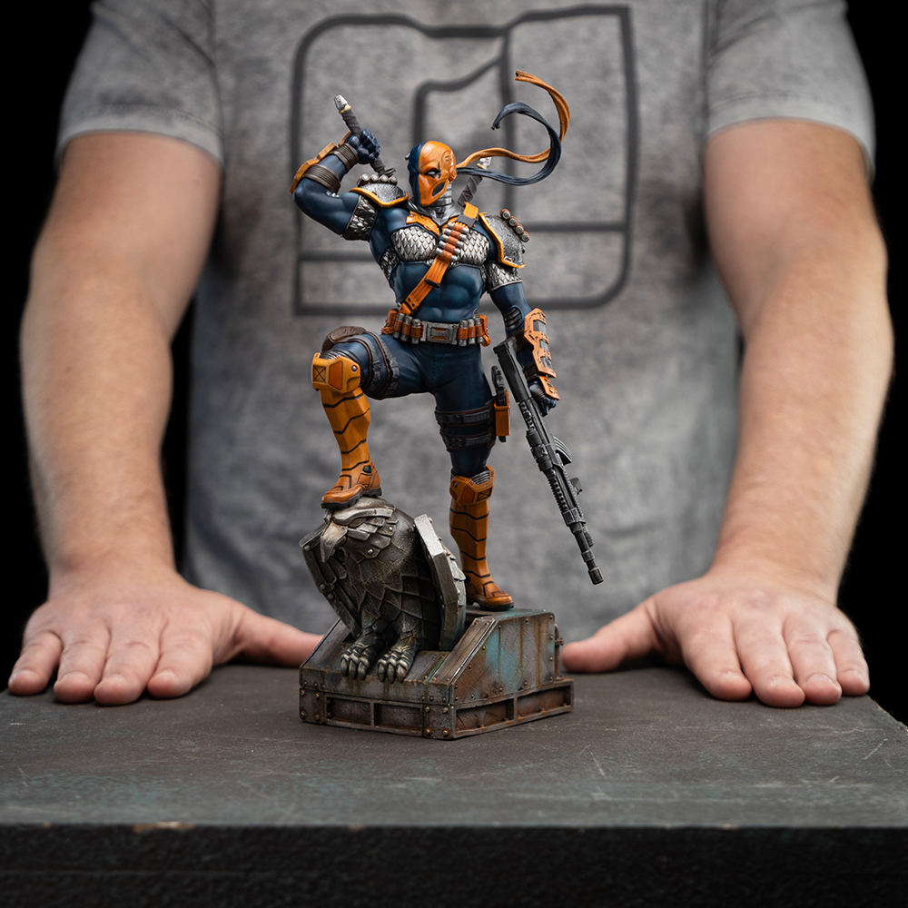 Стоя на горгулье в форме орла, мы видим, как Дэтстроук правой рукой достает свой любимый меч из ножен за спиной, а в левой держит винтовку. Вооруженный и готовый к бою, он выглядит внушительно, позволяя отчетливо разглядеть детали его оранжевой, синей и черной брони, частично изготовленной из материала под названием прометий, вымышленного искусственного сплава, способного поглощать энергию, известного как самый прочный металл во вселенной DC. И вот как мы представляем Дэтстроука – серию комиксов DC Comics №9 – в масштабе 1/10 от Iron Studios, со всей важностью и известностью, которых заслуживает персонаж.