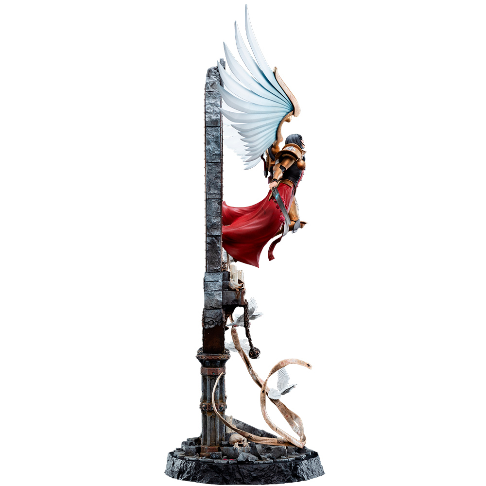 Ее сияющие золотые доспехи выполнены с исключительной точностью, повторяя свое священное предназначение и создавая божественное великолепие, которое резко контрастирует с разрушенными, обветшалыми останками войны внизу. Селестина, словно невесомо парящая среди разрушенной каменной кладки, привносит новую надежду в опустошение, запечатленное на некогда священном камне, который теперь залит светом спасения. Благодаря высокому мастерству и оригинальному дизайну наши мастера воплотили красоту и опасность в этой статуе, которая одновременно завораживает и наводит страх.