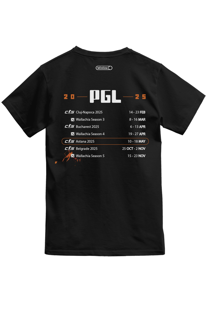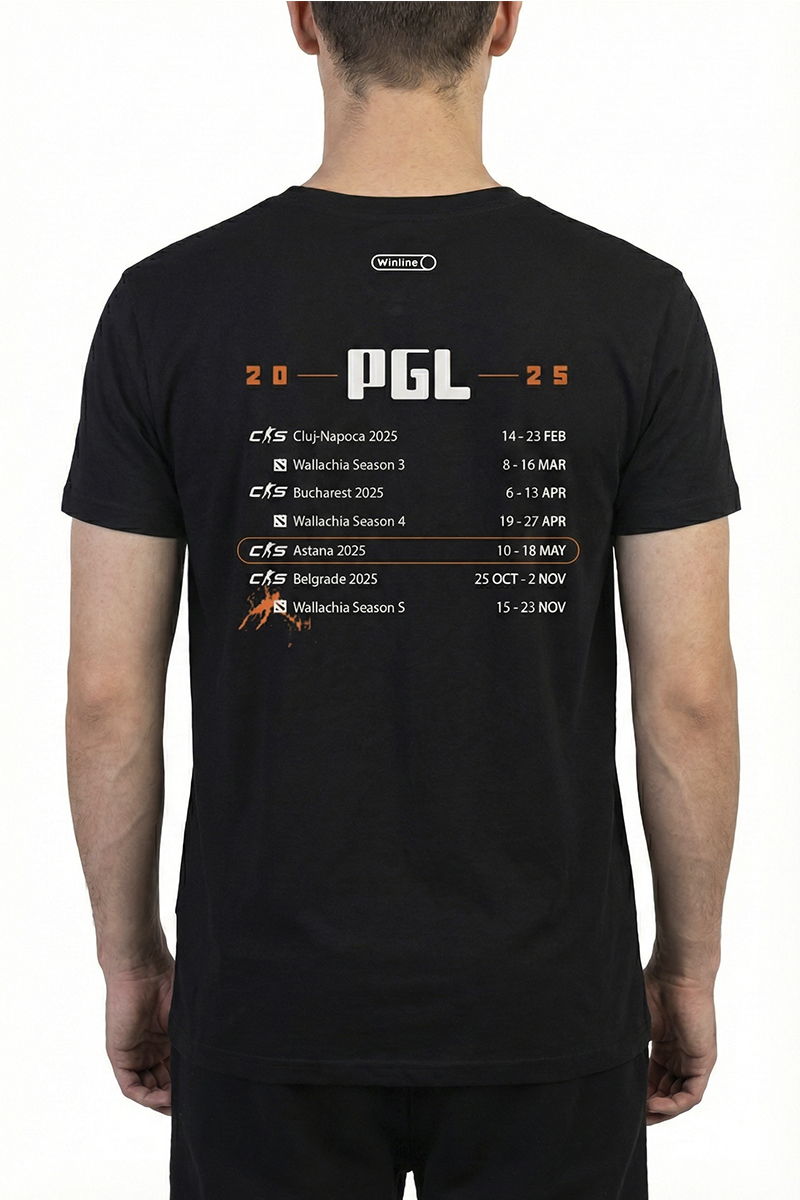 - История на твоих плечах: На спине расположен полный календарь мирового тура PGL 2025. От Клуж-Напоки до Белграда — ключевой акцент сделан на Astana 2025 (10–18 мая), выделенной золотой рамкой.