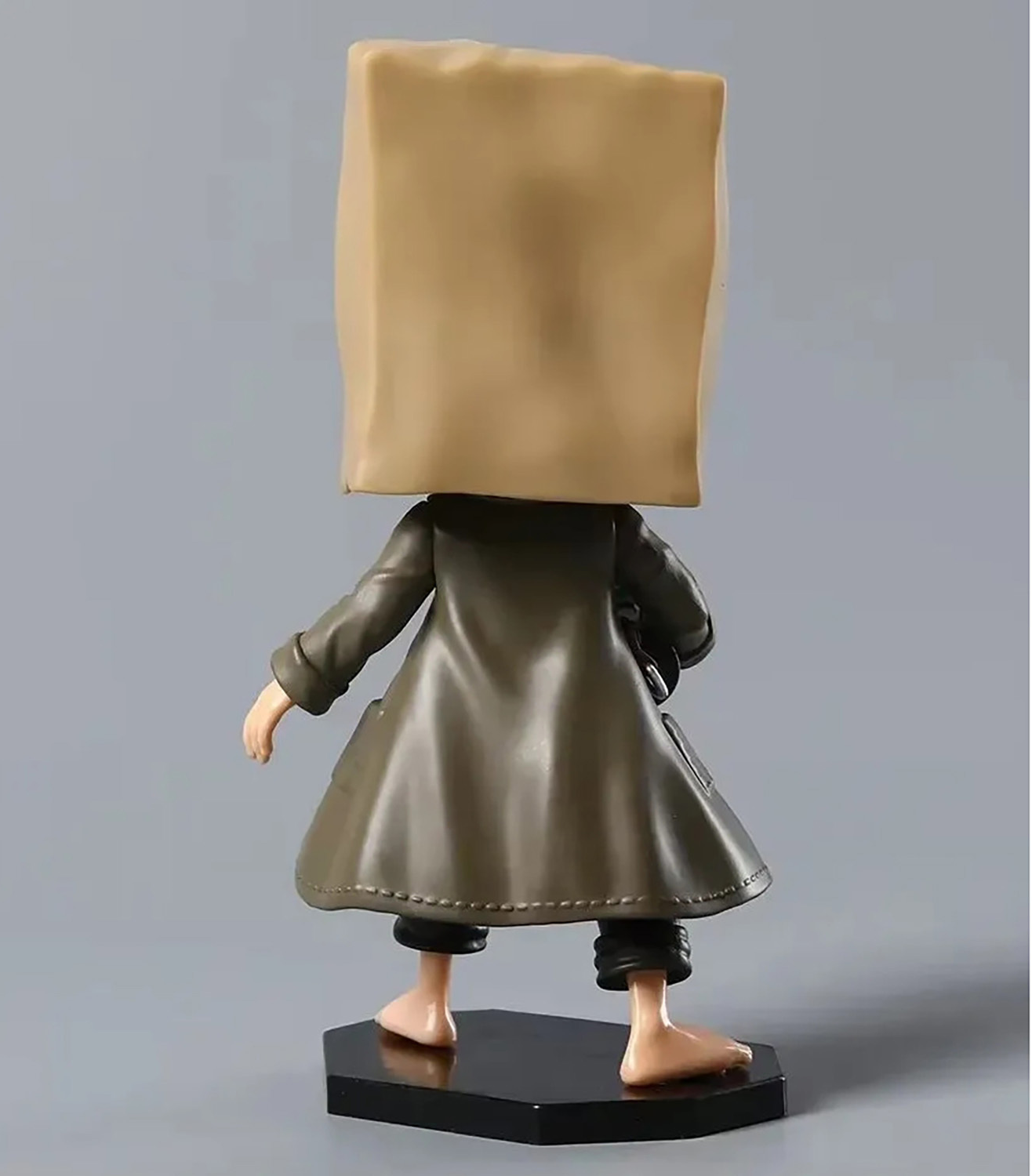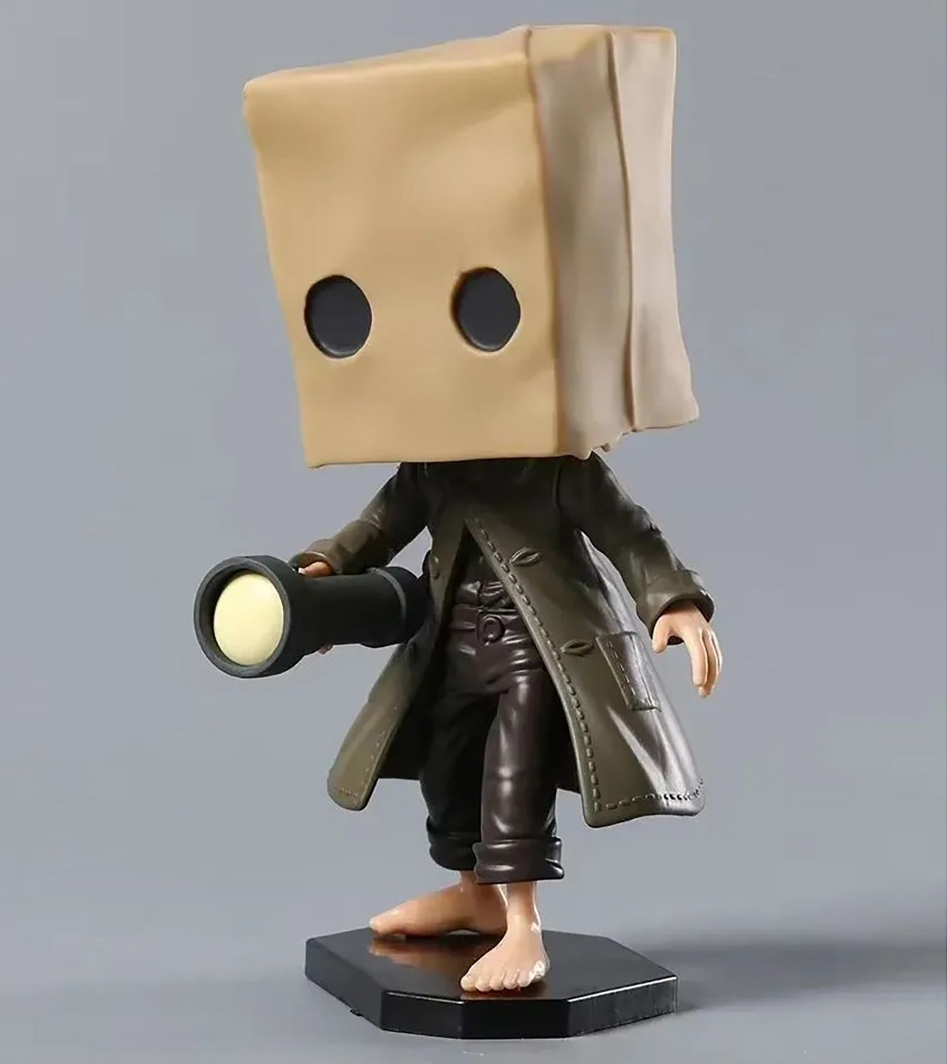 Главный герой игры Моно в своем коричневом пальто и бумажном пакете на голове. Фигурка передает его хрупкость и таинственность в мрачном мире «Маленьких кошмаров».