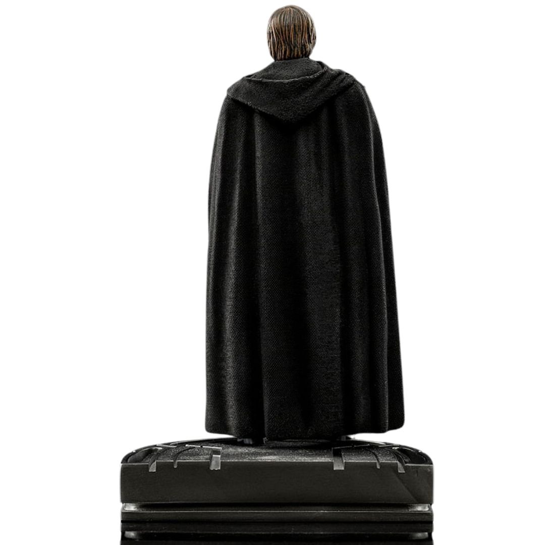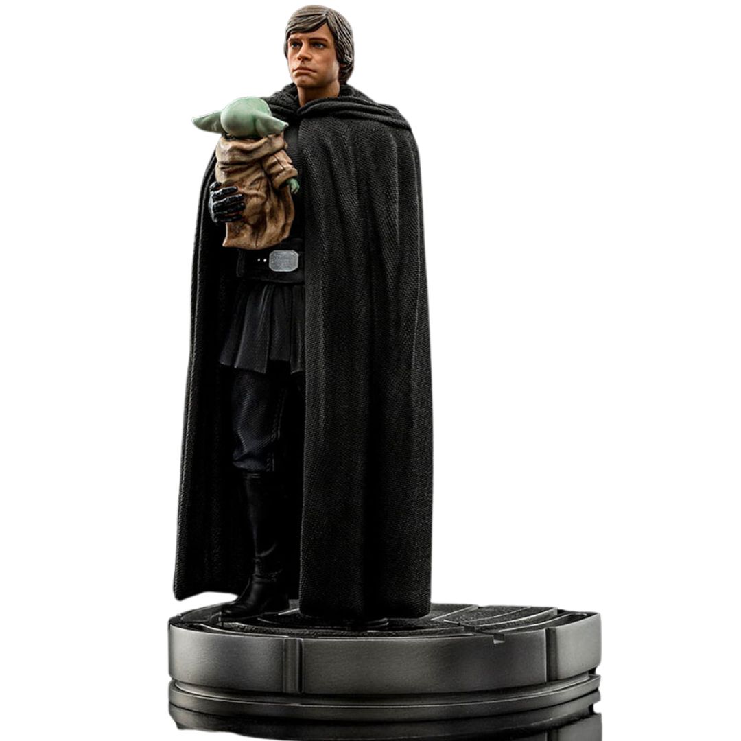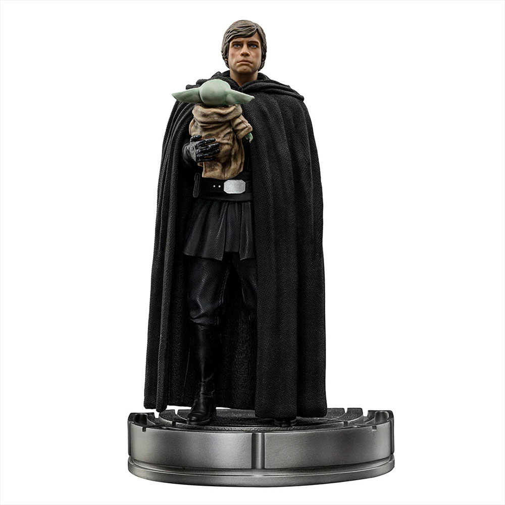 Держа за правую руку чувствительного к Силе ребенка по имени Грогу, представителя того же вида, что и его старый учитель Йода, и так же, как и он, имеющего сильную связь с могуществом Силы, Мастер-джедай, одетый в плащ и черный костюм, размышляет со спокойствием и мудростью, после ответа обращаюсь к маленькому существу, которое теперь должно пройти путь ученика со своим новым опекуном и мастером. Одна из самых захватывающих сцен последнего эпизода 2-го сезона сериала “Мандалорец” на стриминговом сервисе Disney+ мастерски представлена в статуэтке “Люк Скайуокер и Грогу". – Масштаб мандалорианского искусства 1/10 дюйма от Iron Studios.