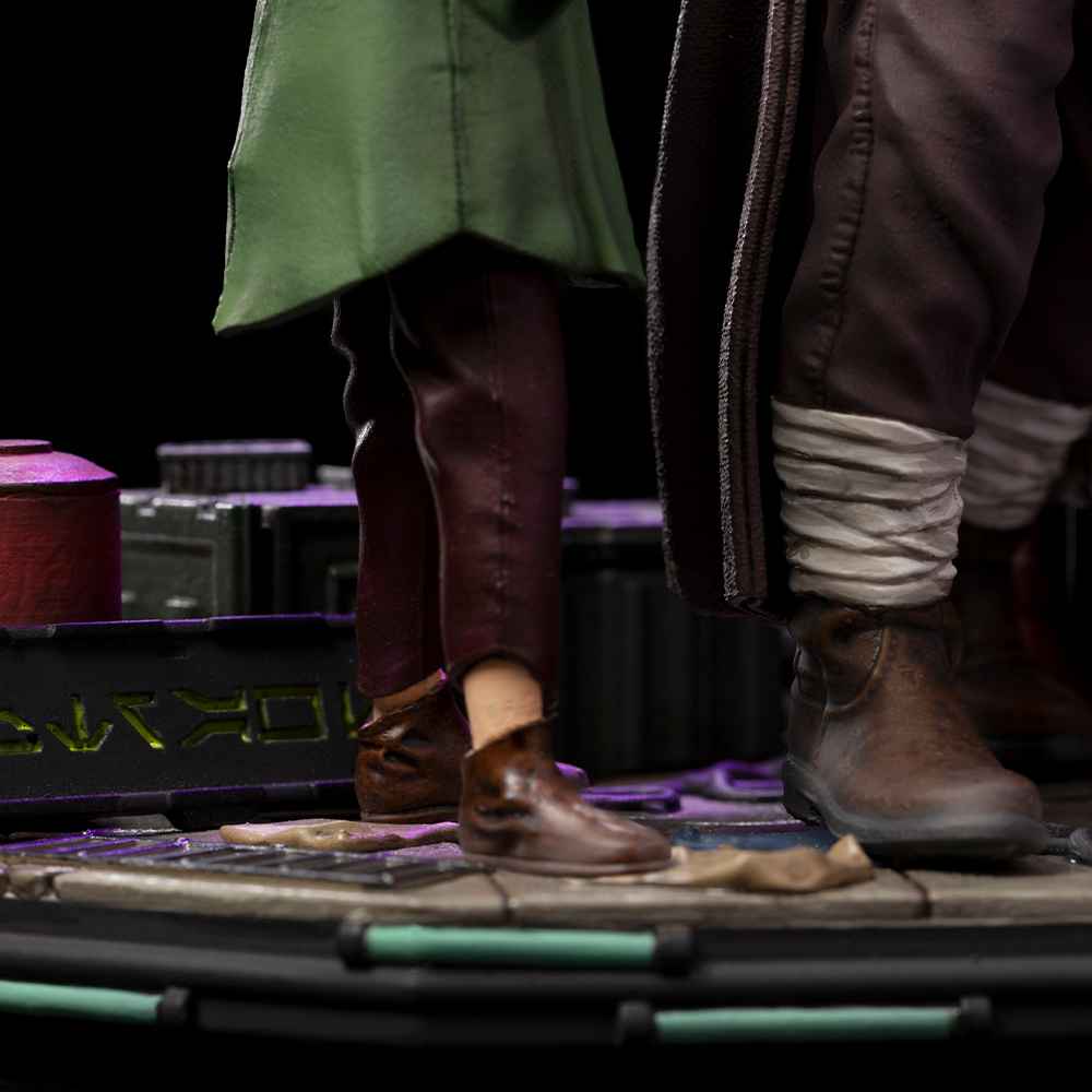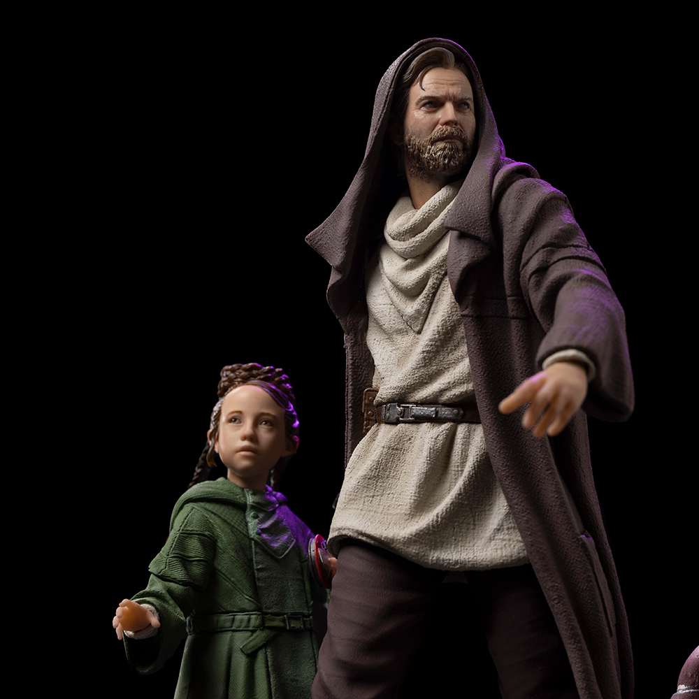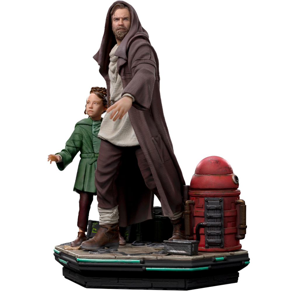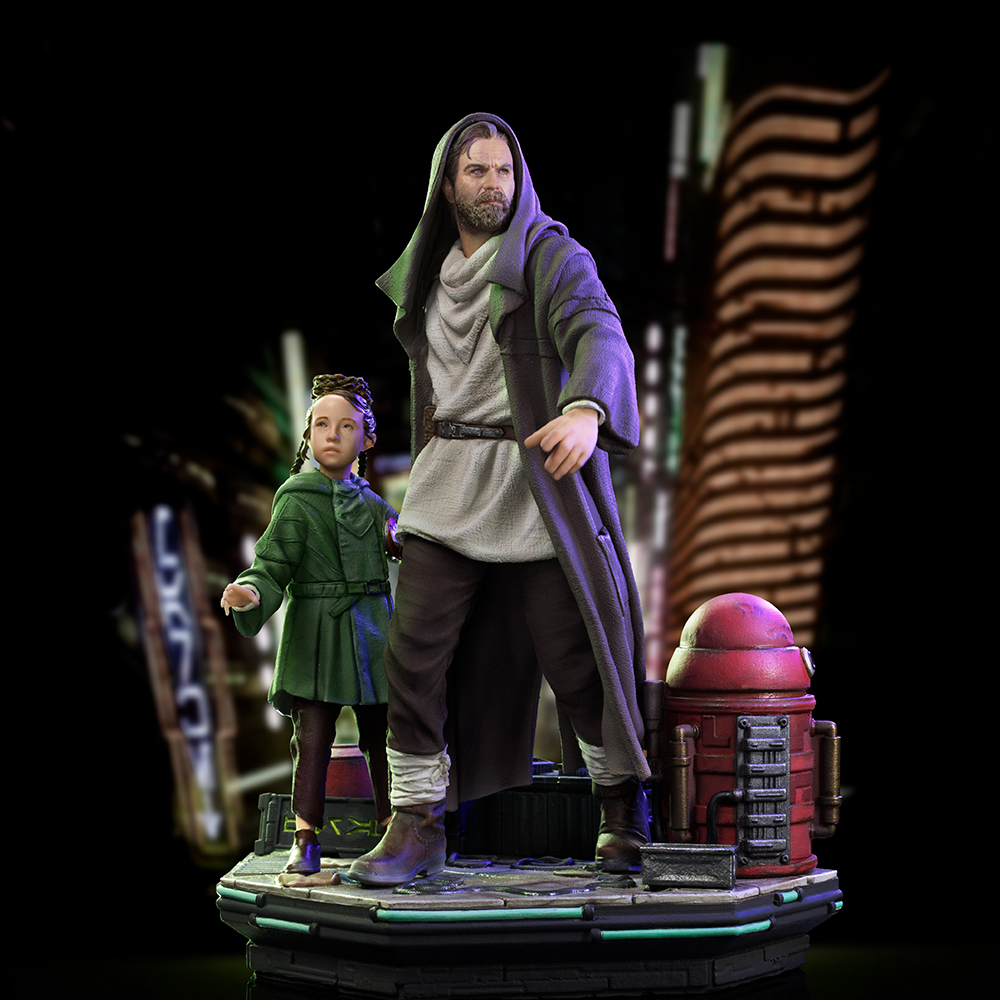 Непосредственно из спин-оффа “Звездных войн”, выпущенного на стриминговом сервисе Disney+ в 2022 году, студия Iron Studios представляет свою диораму "Оби-Ван и юная Лея Делюкс - Оби-Ван Кеноби в масштабе 1/10", где герой-джедай, мастер Энакина Скайуокера, находится рядом со своей подопечной, дочерью его бывший ученик. После возвышения Империи и превращения Энакина Скайуокера в лорда ситхов Дарта Вейдера, Оби-Ван Кеноби забрал одного из детей-близнецов Энакина, Люка, без ведома Энакина об их существовании, на пустынную планету Татуин, где он оставил его на попечение своих дядей, в то время как отец Люка о сестре Лее заботился вице-король Альдераана Бейл Органа, чтобы защитить их обоих и не дать им пойти по темному пути, по которому пошел их отец. Взяв псевдоним Бен Кеноби, он оставался в изгнании на Татуине, чтобы защищать Люка, в то время как Лея воспитывалась как дочь Бейла и принцесса Королевского дома Альдераана. Одержимый желанием найти своего старого учителя и отомстить ему, Дарт Вейдер поручил своим агентам Инквизиториуса, группе охотников и бывших джедаев, перешедших на темную сторону Силы, найти Оби-Вана. Чтобы привлечь Кеноби, агент, известная как Третья сестра, вступила в заговор и организовала похищение Леи, когда ей было 10 лет, на Альдераане, заподозрив дружеские отношения между Бейлом и Оби-Ваном. Выследив наемника, похитившего Лею, Бейл сообщил Кеноби, что отправился на планету Дайю, чтобы спасти ее. Во время побега с маленькой принцессой, в этом приключении они создали крепкие дружеские узы, которые с тех пор объединили их в борьбе против Империи.