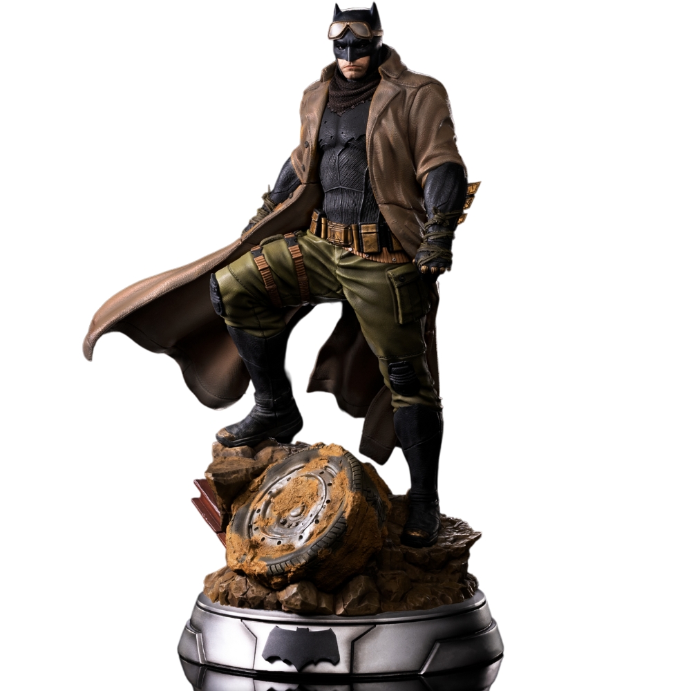 В мире, превращённом в безжизненную пустыню, где песчаные бури воют над руинами цивилизации, лишь один человек всё ещё сопротивляется. Тёмный рыцарь — измученный, но непокорённый — стоит на импровизированном пьедестале из обломков, ржавой арматуры и остатков колеса от разбитого автомобиля. Его плащ заменён на полевой хаки-пиджак, под которым всё ещё угадывается его родной костюм. На маске — защитные очки от песка, взгляд — уставший, но полный решимости. Это Бэтмен из кошмара, лидер повстанческой армии в апокалиптическом будущем, созданном в фильме «Лига Справедливости» Зака Снайдера.