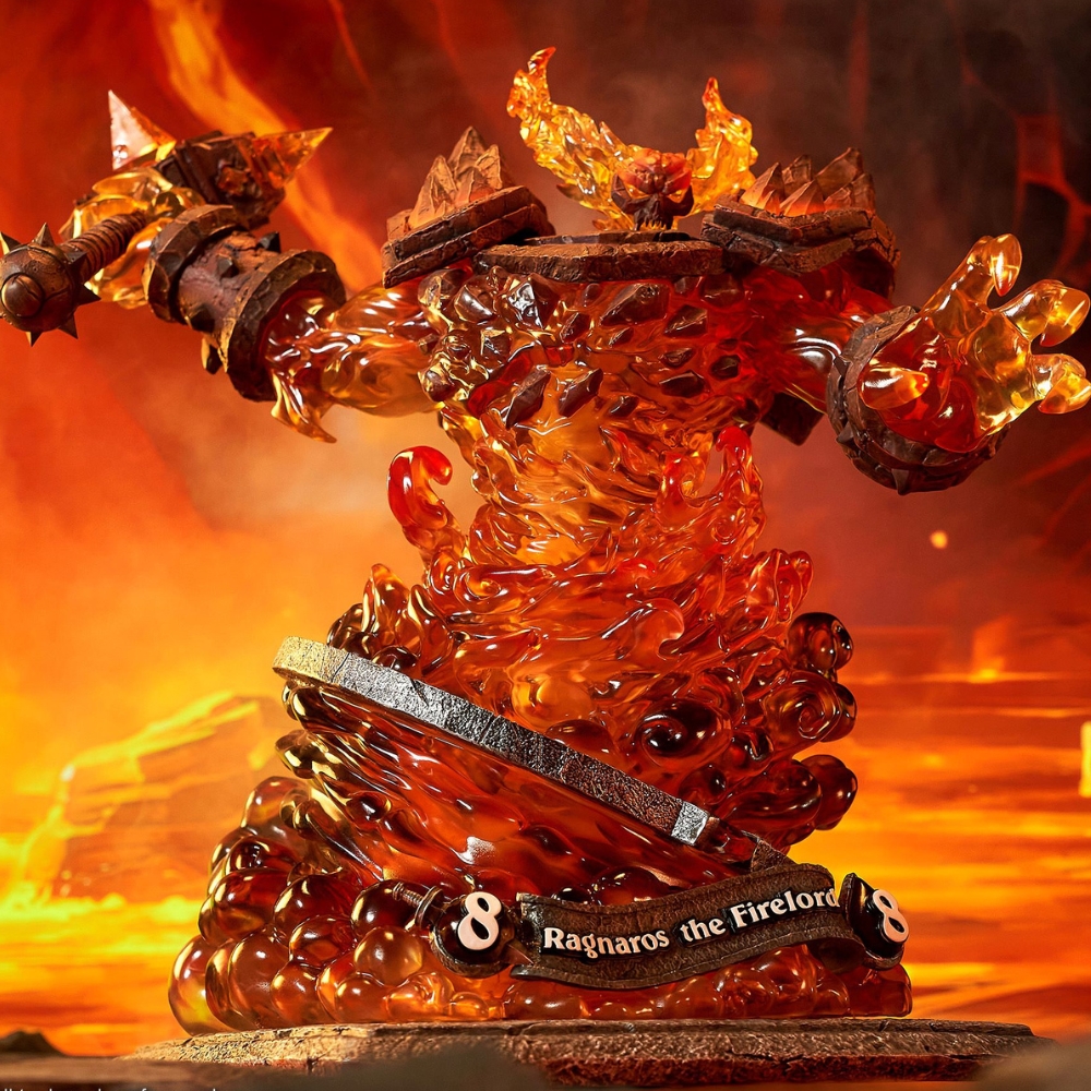 Рагнарос предстаёт в полном величии: с поднятым над головой гигантским молотом Сульфурасом, извергающим пламя и лаву, с телом, сотканным из раскалённой магмы, и взглядом, способным испепелить любого, кто осмелится бросить ему вызов. Его поза — это момент, когда он вырывается из глубин земли, чтобы уничтожить всё на своём пути. Статуэтка выполнена с потрясающей детализацией: от текстуры застывшей лавы на его теле до динамичных языков пламени, окружающих его ноги и оружие.