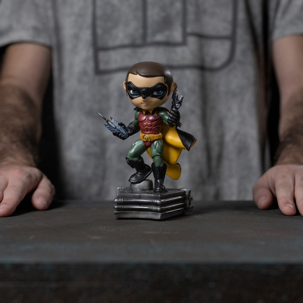 - Уникальная композиция: Робин с микро-Бэтмобилем и Бэтботом — символы его нетерпеливого героизма