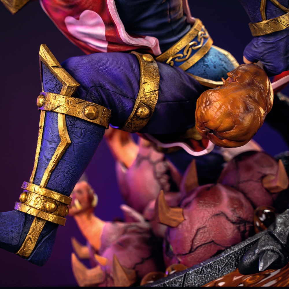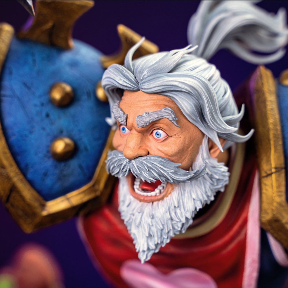 Каждая черта его оскаленного лица, каждый рельеф напряжённых мышц и каждый след от сражений на потрёпанной броне тщательно вылеплены, чтобы запечатлеть этот легендарный момент безумной отваги. В правой руке Лирой вздымает свой могучий меч, а в левой — невероятно, но факт — зажата надгрызённая куриная ножка. Его безумный взгляд, раскрытый в боевом кличе рот и напряжённая поза создают ощущение, будто он вот-вот вырвется из статуэтки и ринется в атаку!